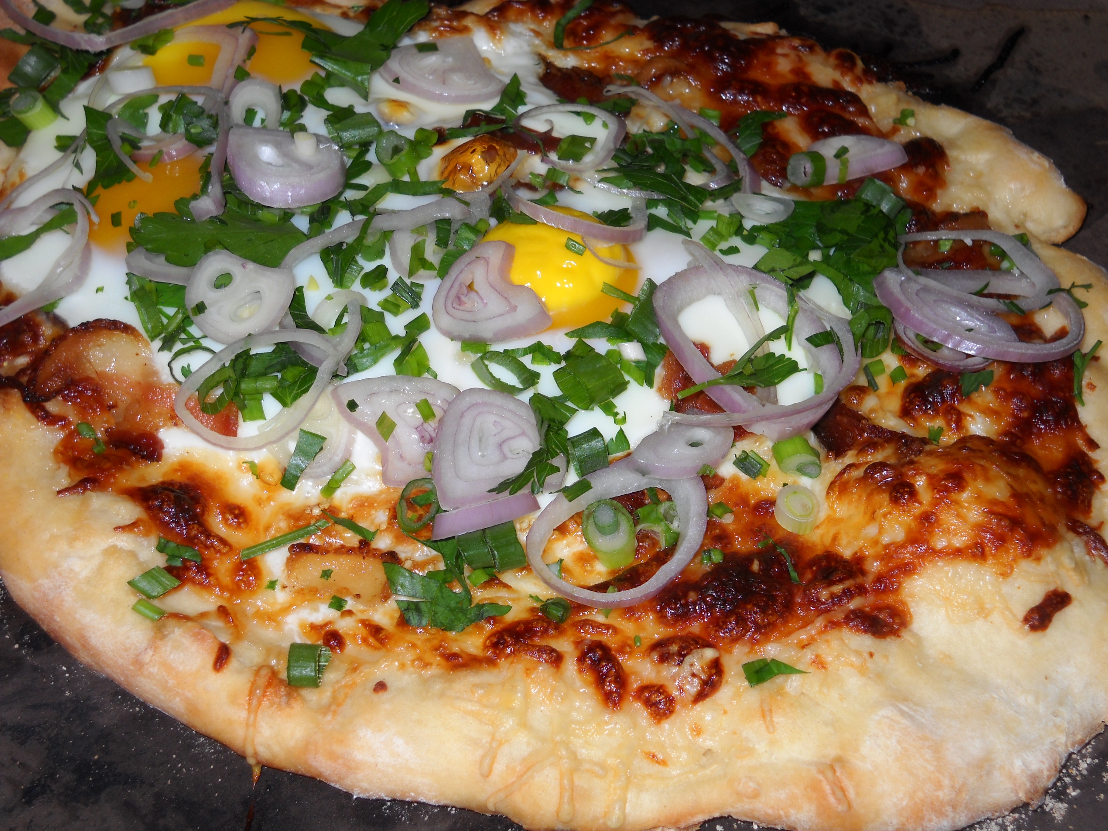 Well, it actually turned out to be breakfast pizza, then leftover pizza. And then, with remaining ingredients, I made a very similar dinner pizza. I found the recipe here.