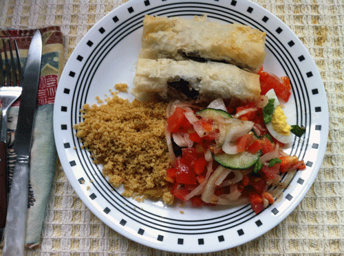 It turns out that this meal turned out to be quite enjoyable. Of particular note is the flavor combination in the bourek. I forget sometimes that cinnamon can have savory applications and be quite good that way. I surprised myself by liking the semolina cake. Normally, with the exception of Chick-o-Sticks, I do not like anything that has dry shredded coconut on it. There is something about that texture that reminds me of chapped lips. Here, though, the coconut didn’t have that texture at all. Speaking of textures, today I actually achieved a couscous texture that isn’t disgusting. Unlike with the coconut, I don’t blame the couscous at all. Usually things go bad when I get my hands on the couscous.
